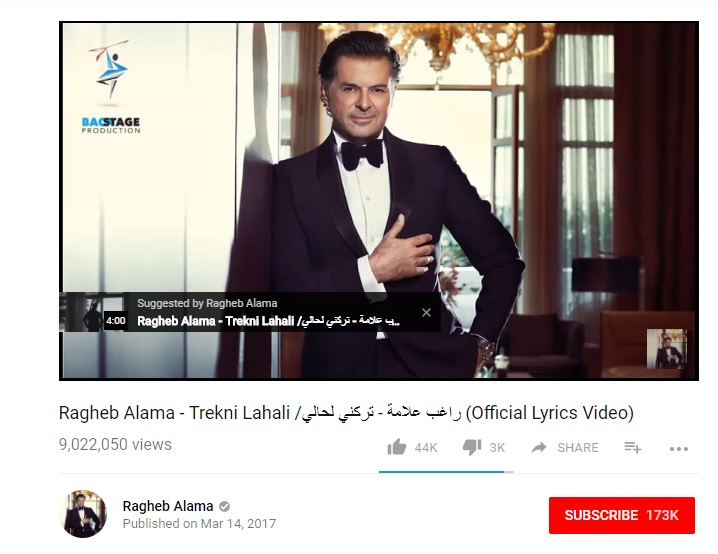 تخطّى السوبر ستار راغب علامة حاجز الـ 9 مليون مشاهدة بفيديو كليب (تركني لحالي) عبر حسابه الرسمي على يوتيوب.