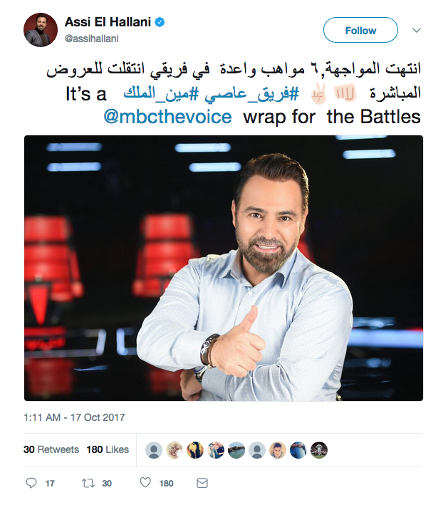 اعلن فارس الغناء عاصي الحلاني عبر حسابه الخاص على موقع التواصل الاجتماعي تويتر، ان المواجهة انتهت باختيار 6 مواهب واعدة في فريقه ببرنامج (ذا فويس)، وانتقلت للعروض المباشرة.