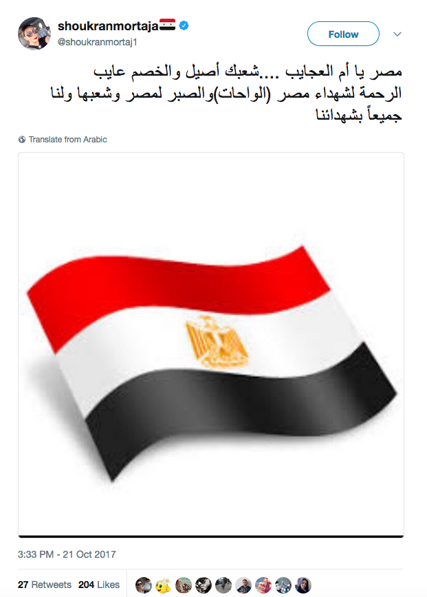 علّقت الممثلة شكران مرتجى عبر حسابها الخاص على موقع التواصل الاجتماعي تويتر عن الهجوم المسلح الذي شهدته منطقة الواحات في الجيزة، قائلة: