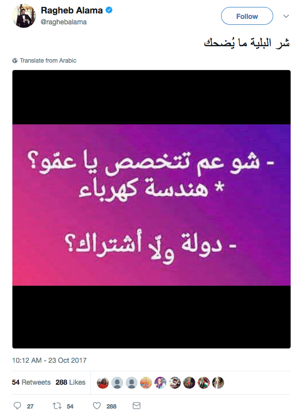 نشر السوبر ستار راغب علامة عبر حسابه الخاص على موقع التواصل الاجتماعي تويتر صورة ساخرة عن الكهرباء في لبنان، وارفقها بعبارة قائلا: