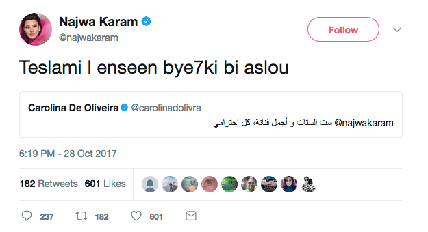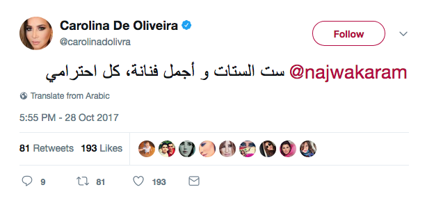 أعربت الفنانة والإعلامية كارولينا دي أوليفيرا عن إعجابها الكبير بشمس الأغنية نجوى كرم واصفة إياها بـ(ست الستات).