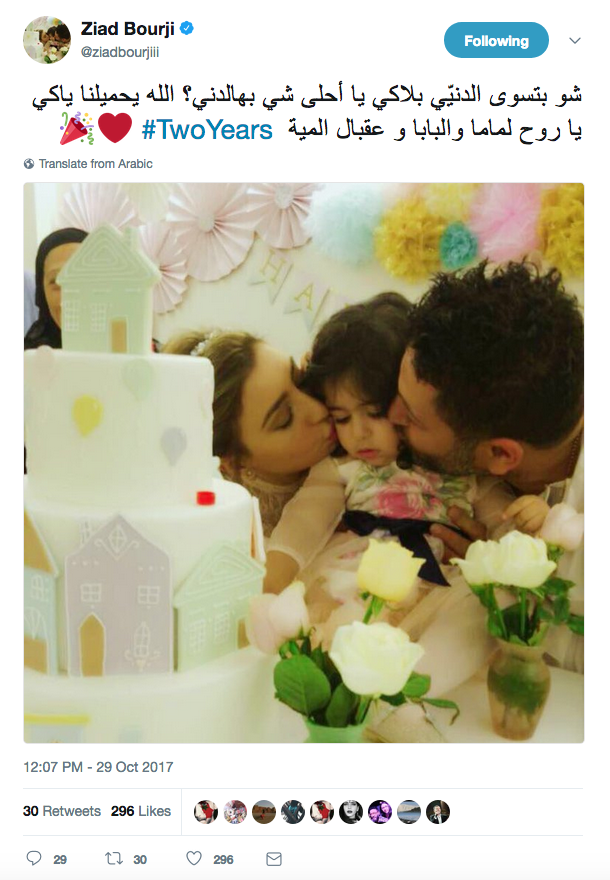 ونشر زياد عبر حسابه الخاص على موقع التواصل الاجتماعي تويتر صورة تجمعه بزوجته وابنته خلال حفلة ميلادها.