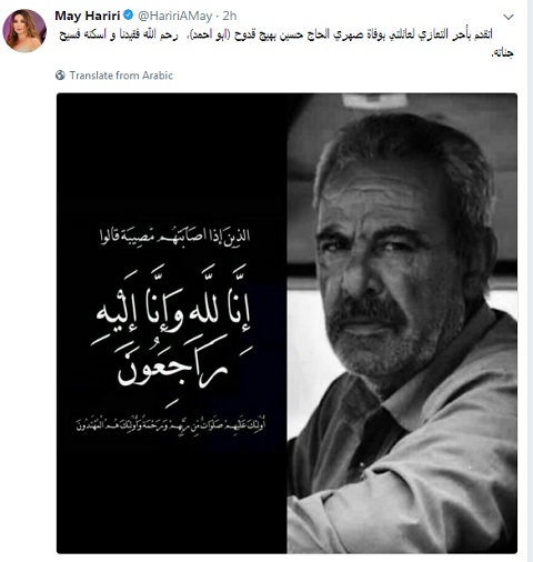 بعد أيام معدودة على حلول الذكرى السنوية الأولى لوفاة الموسيقار الكبير ملحم بركات، أعلنت الفنانة مي حريري عبر صفحتها في موقع التواصل الاجتماعي (فيسبوك) وفاة صهرها حيث كتبت: