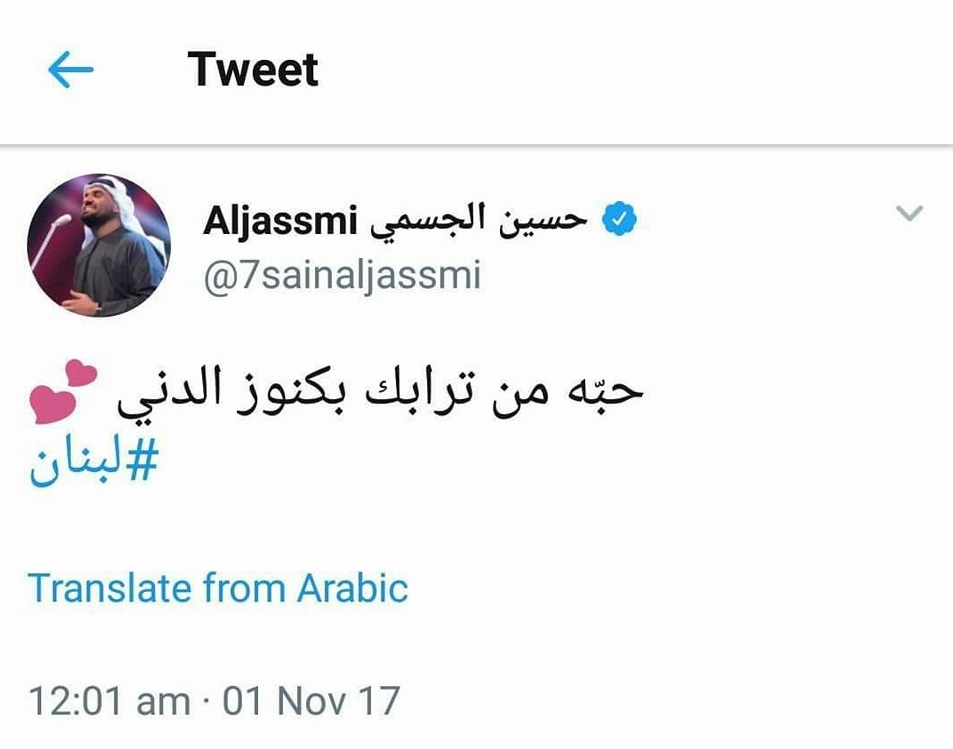 أقدم النجم الإماراتي حسين الجسمي على حذف تغريدة مدح فيها لبنان، وذلك بعد حملة هجمات ساخرة تلقاها عقب إستقالة رئيس مجلس الوزراء اللبناني سعد الحريري من الحكومة اللبنانية.