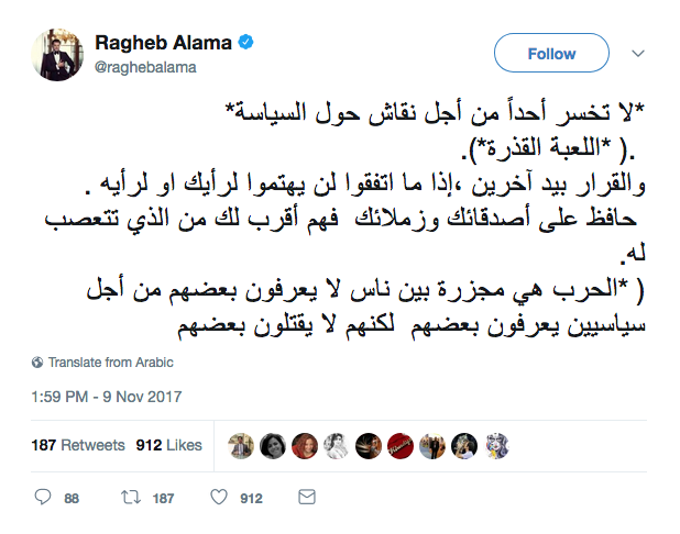 وصف السوبر راغب علامة السياسة بـ(اللعبة القذرة) داعيًا الجميع إلى عدم خسارة أحد بسبب النقاشات السياسية.