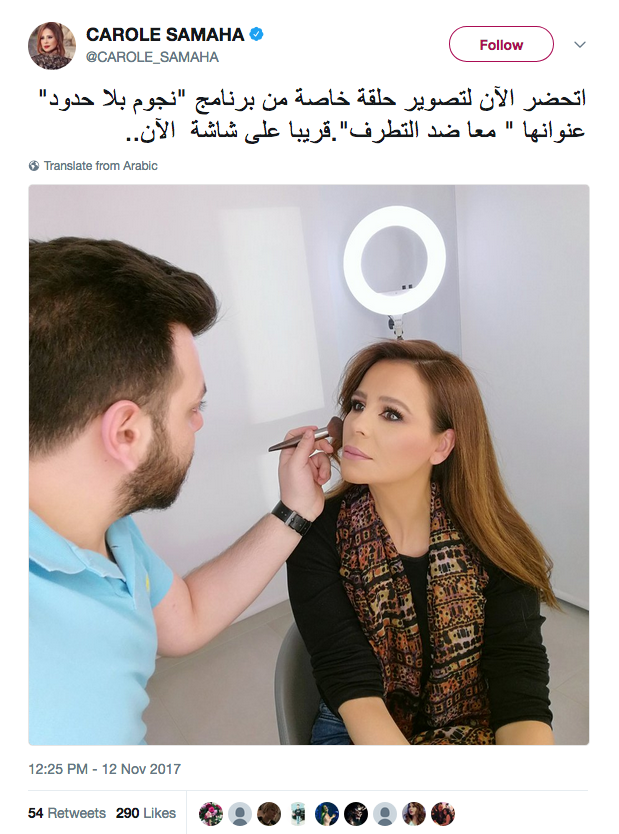 نشرت النجمة اللبنانية كارول سماحة عبر حسابها الخاص على موقع التواصل الاجتماعي تويتر صورة خلال التحضيرات لتصوير حلقة من برنامج (نجوم بلا حدود)، وعلّقت عليها قائلة:
