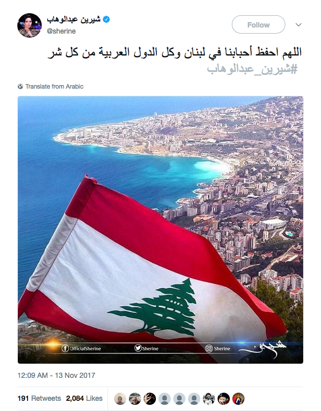 نشرت النجمة المصرية شيرين عبد الوهاب عبر حسابها الخاص على موقع التواصل الاجتماعي تويتر صورة للعلم اللبناني، وعلّقت قائلة: