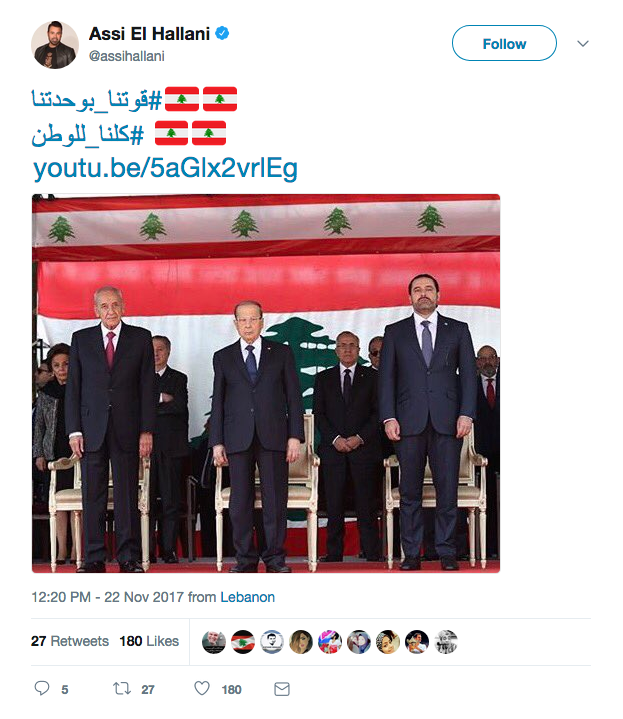 في السياق، نشر فارس الغناء صورة الرؤساء الثلاث ميشال عون، نبيه بري وسعد الحريري مرفقًا تغريدته بفيديو قوتنا بوحدتنا.