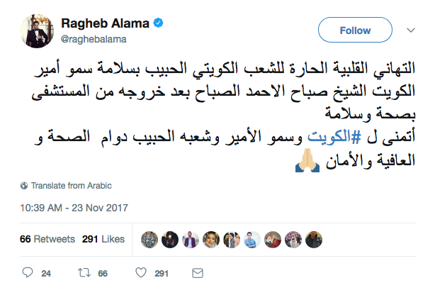 هنّأ السوبر ستار راغب علامة الشعب الكويتي عبر حسابه الخاص على موقع التواصل التواصل الاجتماعي تويتر، قائلا: