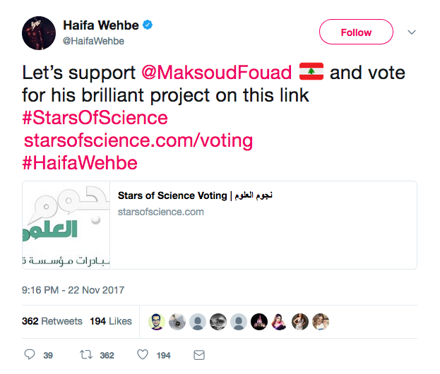 ونشرت هيفاء رابط التصويت لفؤاد، ودعت محبيها للتصويت له بكثافة كي يفوز بالمسابقة، قائلة: