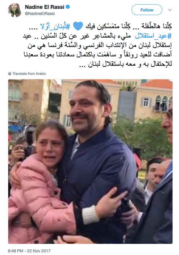 نشرت النجمة نادين الراسي عبر حسابها الخاص على موقع التواصل الاجتماعي تويتر صورة لفتاة صغيرة تبكي باحضان الرئيس سعد الحريري.