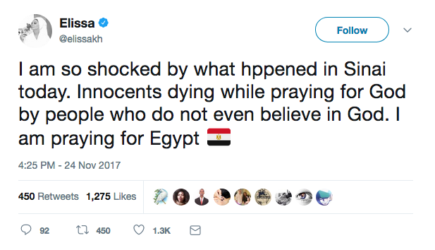 دانت ملكة الاحساس اليسا الهجوم الذي اسفر عن سقوط عشرات الضحايا داخل مسجد الروضة في العريش، وذلك في تغريدة لها عبر حسابها الخاص على موقع التواصل الاجتماعي تويتر، حيث قالت: