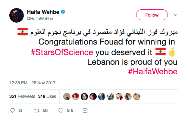 باركت الديفا هيفا وهبي عبر حسابها الخاص على موقع التواصل الاجتماعي تويتر للمخترع اللبناني فؤاد مقصود الذي فاز في برنامج نجوم العلوم.