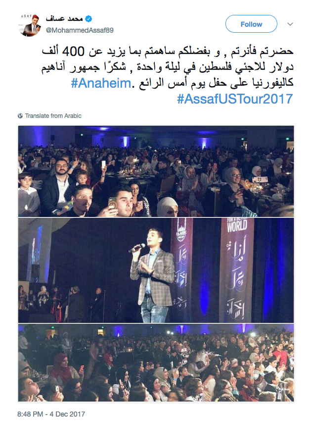 حضرتم فأنرتم، و بفضلكم ساهمتم بما يزيد عن 400 ألف دولار للاجئي فلسطين في ليلة واحدة، شكرًا جمهور آناهيم كاليفورنيا على حفل يوم أمس الرائع.