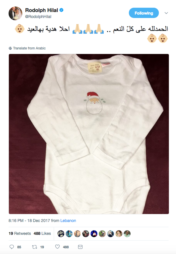 ونشر رودولف عبر حسابه الخاص على موقع التواصل الاجتماعي تويتر صورة لثياب طفل رضيع، وعلّق عليها قائلا: