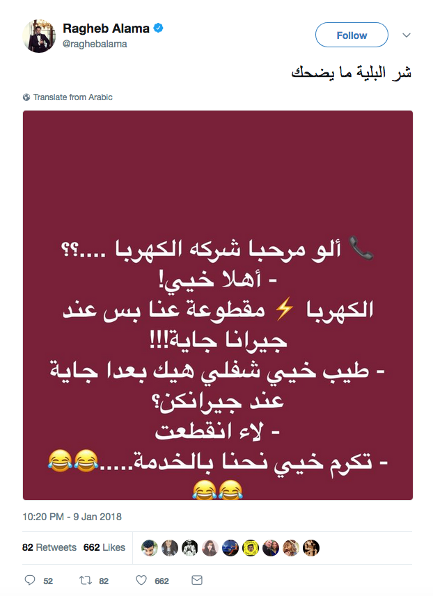 أعرب السوبر ستار راغب علامة عن إستيائه من أزمة الكهرباء في لبنان، مستعرضًا المشكلة عبر نكته تحمل في طياتها الكثير من المعاناة يعيشها المواطنون، وقد أضاف علامة نوعا من روح الفكاهة