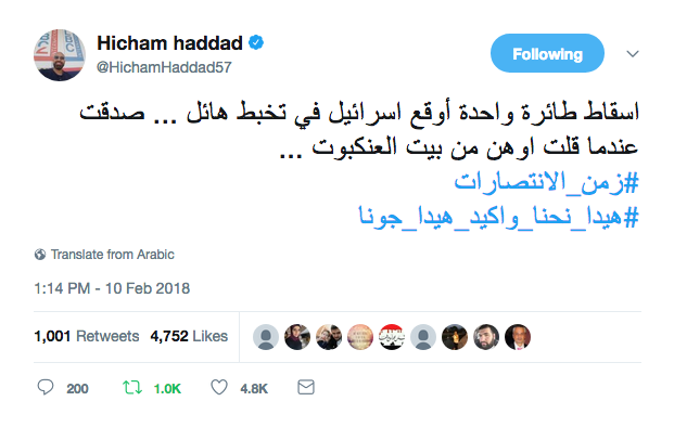 علّق الاعلامي هشام حداد، عبر حسابه الخاص على موقع التواصل الاجتماعي تويتر، تعقيبًا على تصدّي (الجيش السوري) لـ طائرة عسكرية إسرائيلية وإسقاطها في الجولان، قائلا:
