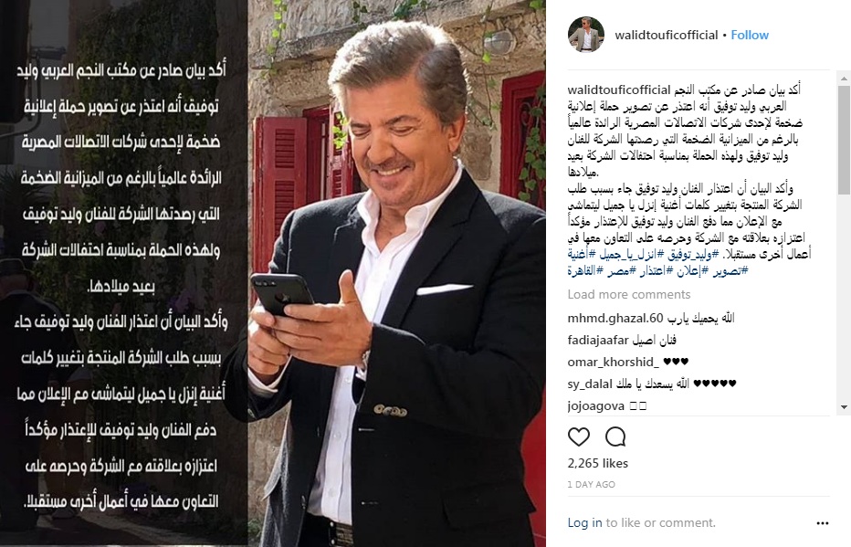 وأكد البيان أن اعتذار الفنان وليد توفيق جاء بسبب طلب الشركة المنتجة بتغيير كلمات أغنية إنزل يا جميل ليتماشى مع الإعلان مما دفع الفنان وليد توفيق للإعتذار مؤكداً اعتزازه بعلاقته مع الشركة وحرصه على التعاون معها في أعمال أخرى مستقبلا.