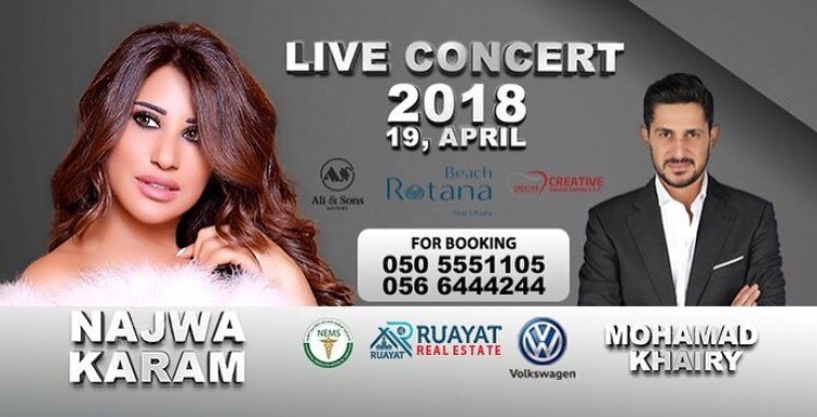 تستعد شمس الاغنية اللبنانية نجوى كرم لاحياء حفل ضخم في فندق (بيتش روتانا) في أبو ظبي مساء الخميس 19 نيسان، حيث ستتألّق بتقديم باقة من أجمل أغانيها القديمة والجديدة.