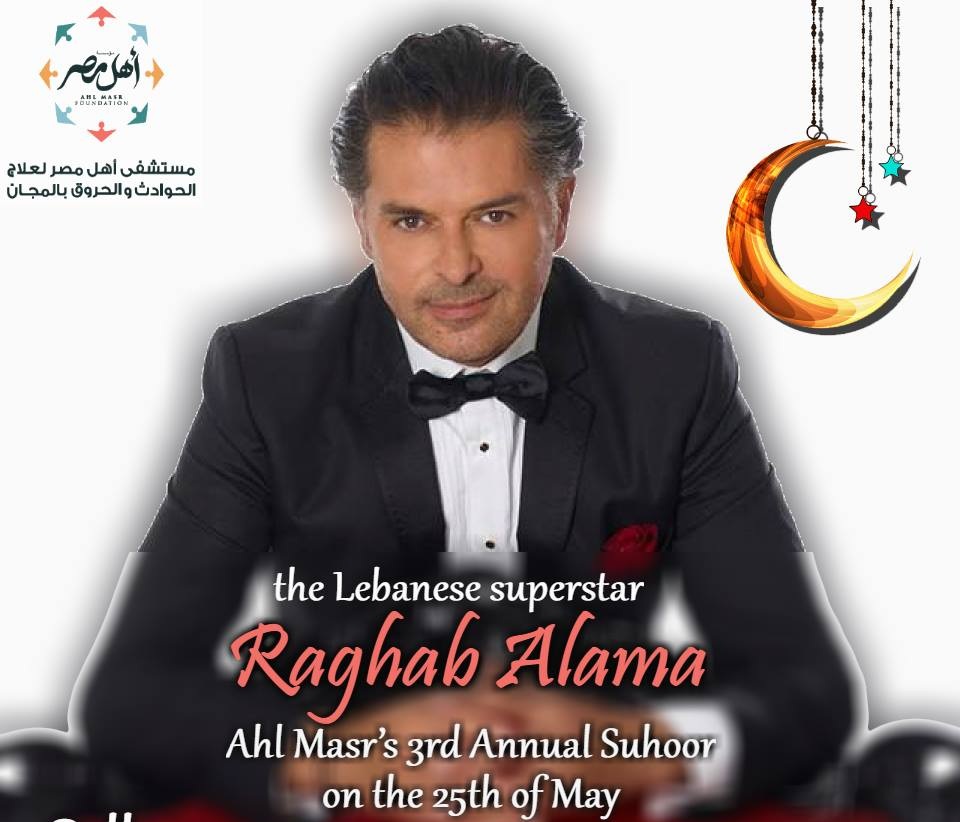 يحيي السوبرستار راغب علامة حفل السحور السنوي الثالث لصالح مستشفى أهل مصر لعلاج الحوادث والحروق بالمجان ويتبرع بأجره بالكامل للمستشفى.