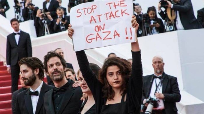 رفعت الممثّلة اللبنانية منال عيسى خلال ظهورها على السجادة الحمراء في مهرجان كانّ الدولي لافتةً كُتب عليها أوقفوا الاعتداء على غزة.